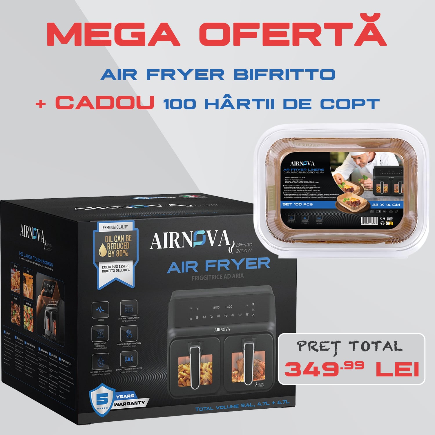 Suntem o familie cu doi copii și air fryer-ul AIRNOVA BiFritto cu 2 compartimente ne salvează zilnic. În 15 minute avem o cină delicioasă. Îl recomand tuturor celor care vor să mănânce mai sănătos, dar nu au timp!