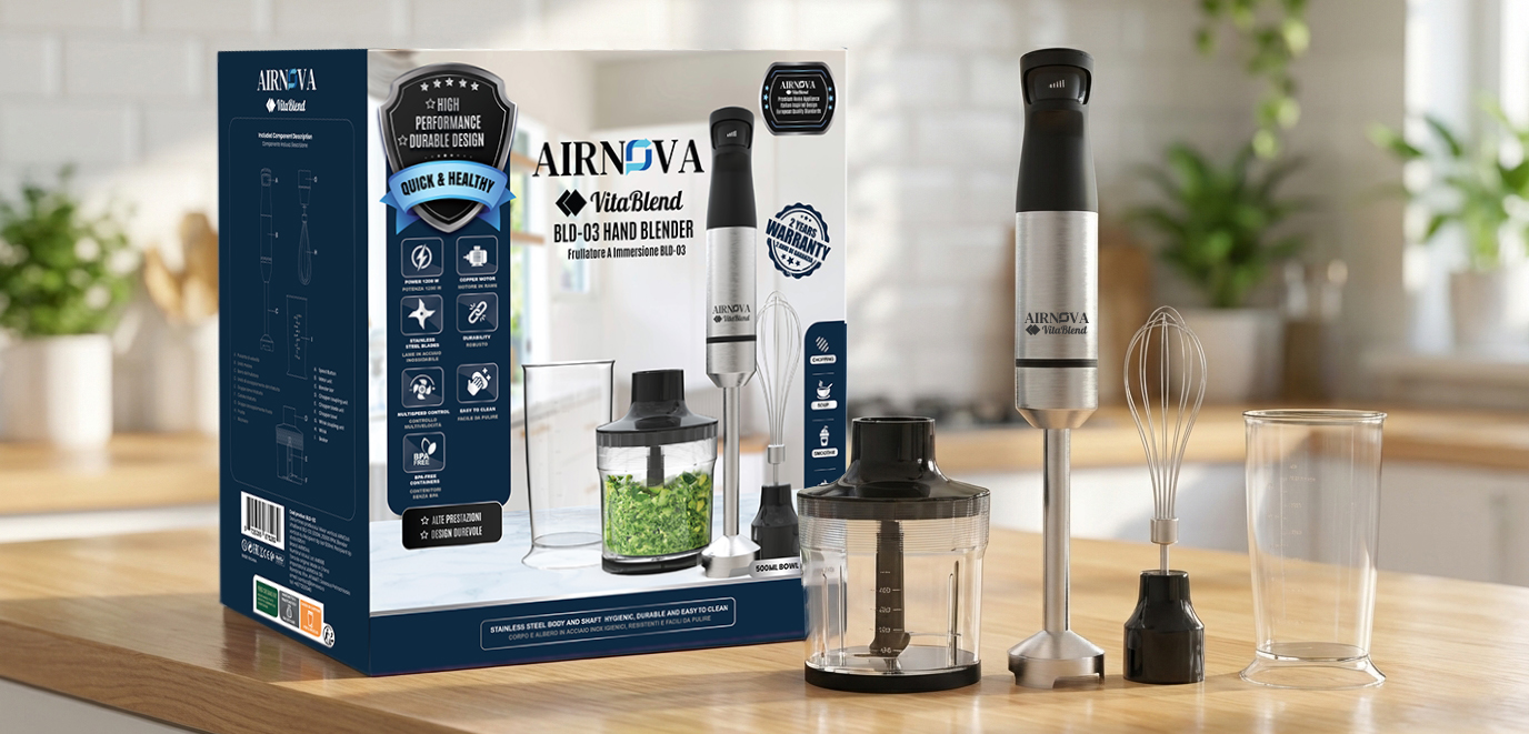 Alege AIRNOVA® BLD-03 – aliatul tau de incredere pentru preparate rapide, sanatoase si delicioase! Simplifica-ti viata in bucatarie si bucura-te de mai mult timp pentru tine si cei dragi. Adauga-l acum in cos!