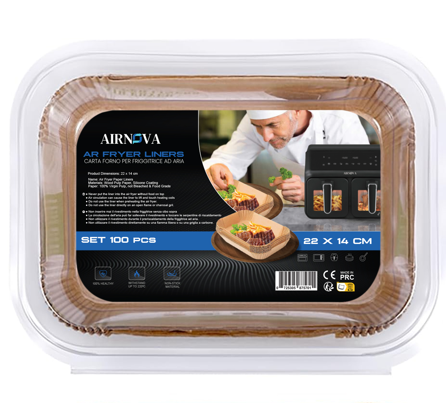 Dimensiuni universale: 22 x 14 x 4.5 cm – ideale pentru air fryer dreptunghiular sau oval.