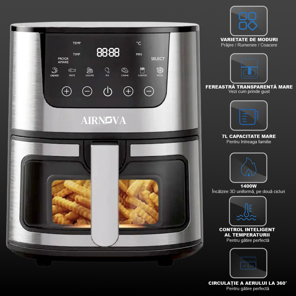 Air Fryer AIRNOVA® OroFritto 1400W, Friteuza cu aer cald, Capacitate 7L brut, Negru/Inox – Gatire sanatoasa si eficienta