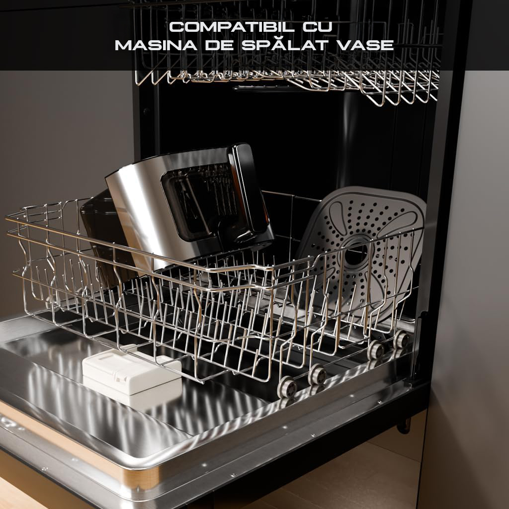 Cuva air fryer-elor noastre NU este din teflon clasic periculos, ci este acoperită cu un strat antiaderent modern, de ultimă generație, special conceput pentru electrocasnice de gătit.